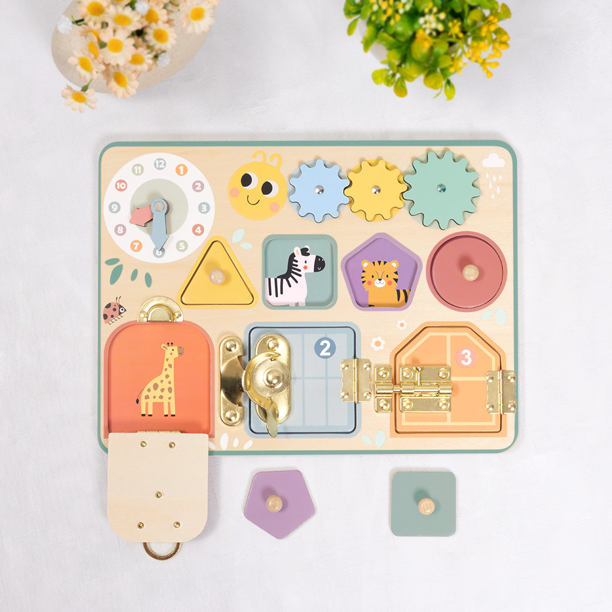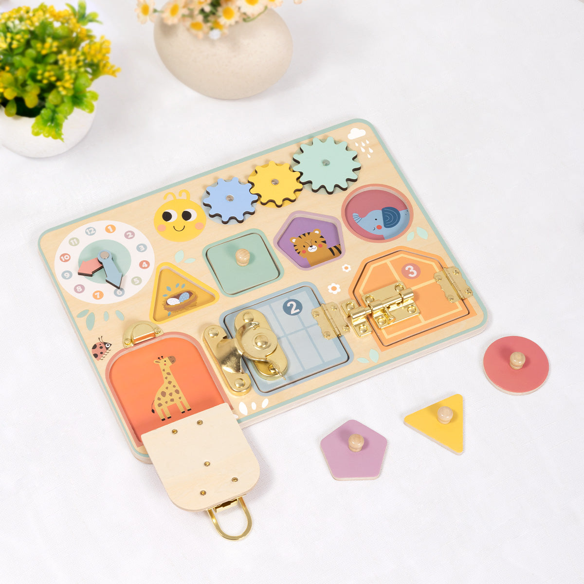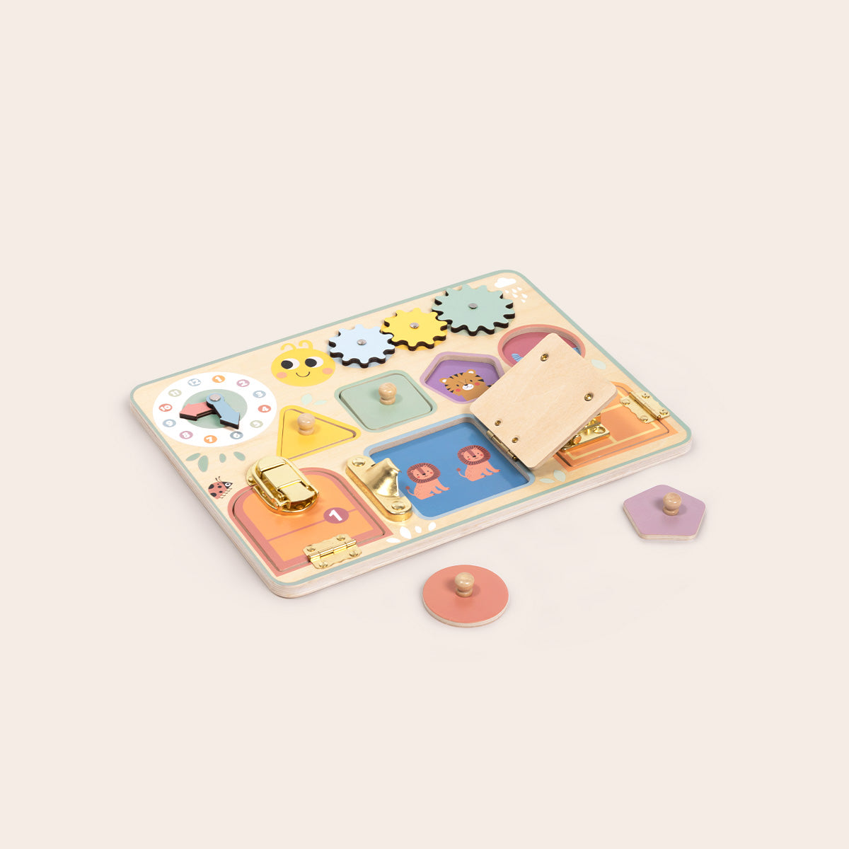 Este tablero sensorial invita a explorar a través del juego libre. Con puertas, engranajes, cerraduras, formas y piezas móviles, estimula la motricidad fina, la coordinación mano-ojo y la curiosidad natural del niño.