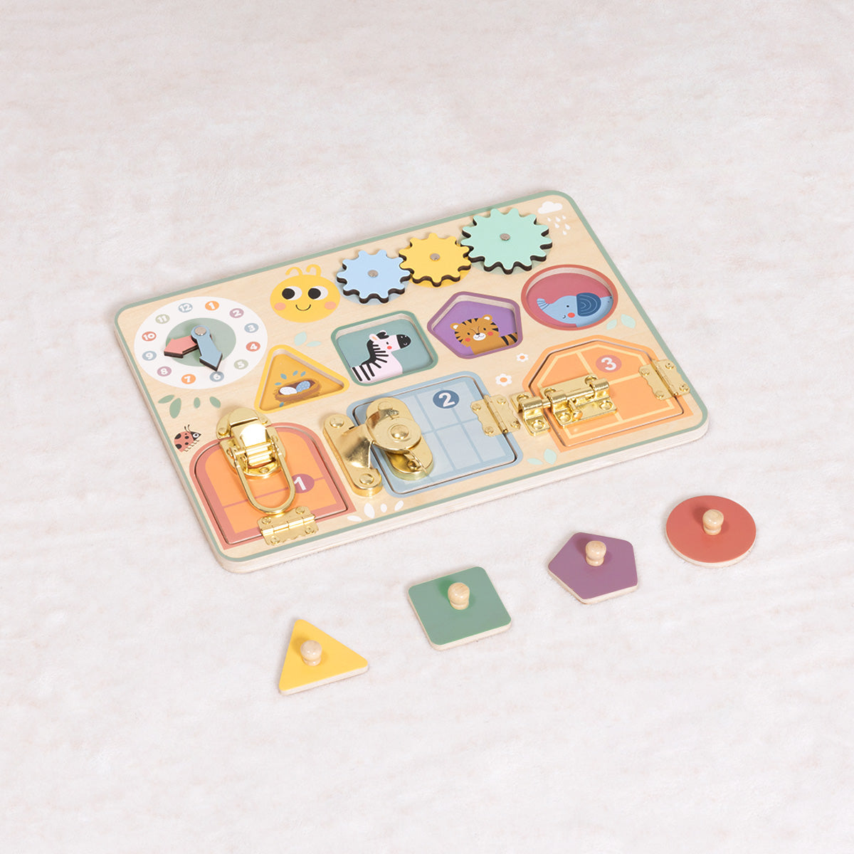 Cada elemento está pensado para que pueda manipular, abrir, girar y descubrir a su propio ritmo, fortaleciendo la concentración y la autonomía. Ideal para momentos de juego tranquilo y aprendizaje significativo.