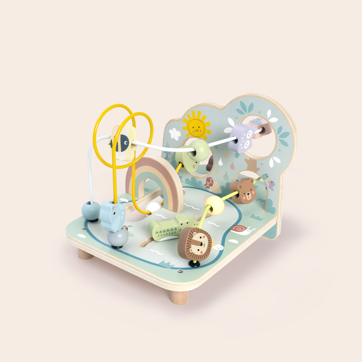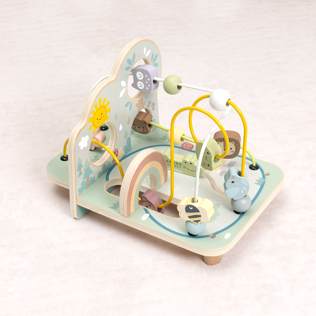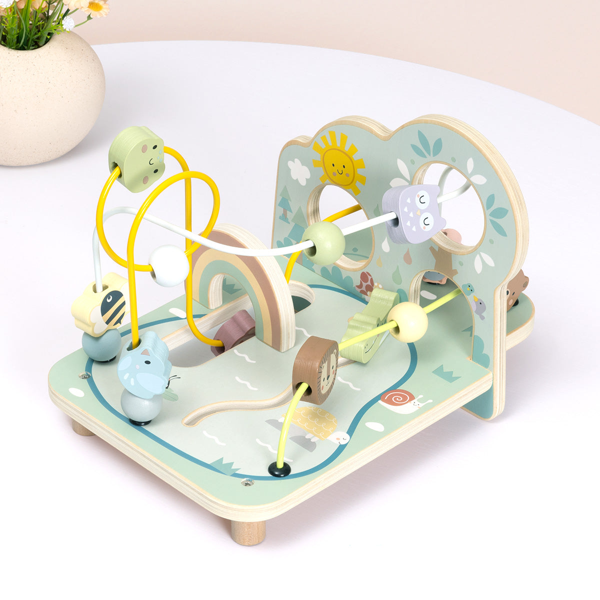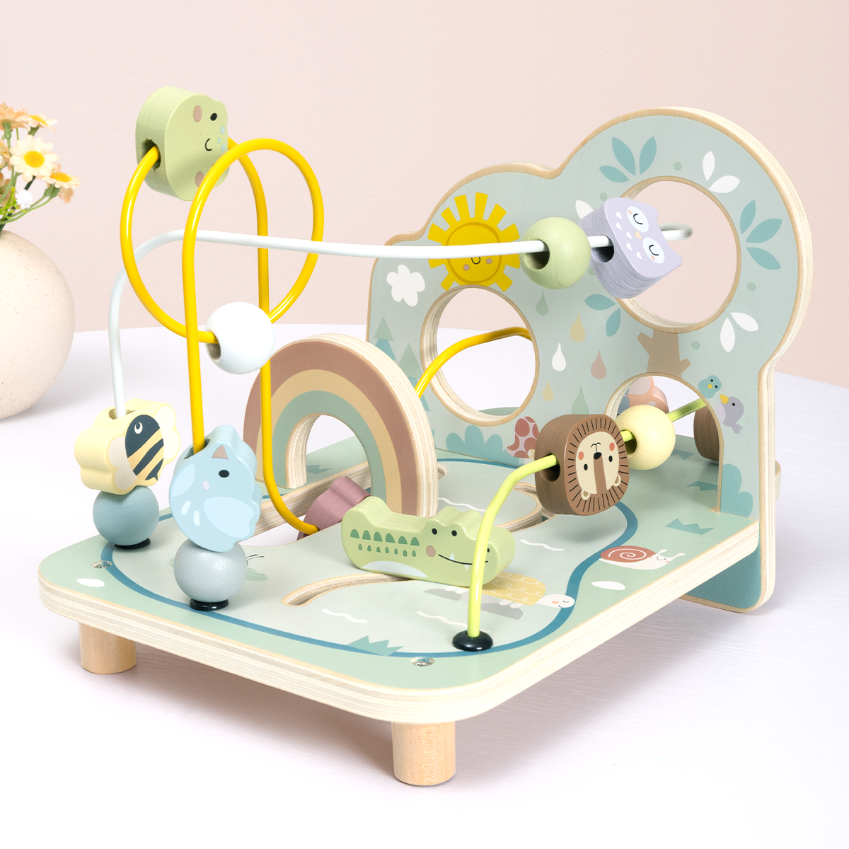 Un espacio de juego diseñado para estimular la coordinación mano-ojo y la exploración temprana. Combina laberintos de cuentas, rampas deslizantes y piezas móviles que invitan al niño a experimentar con el movimiento y la causa-efecto.