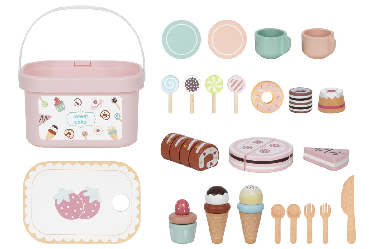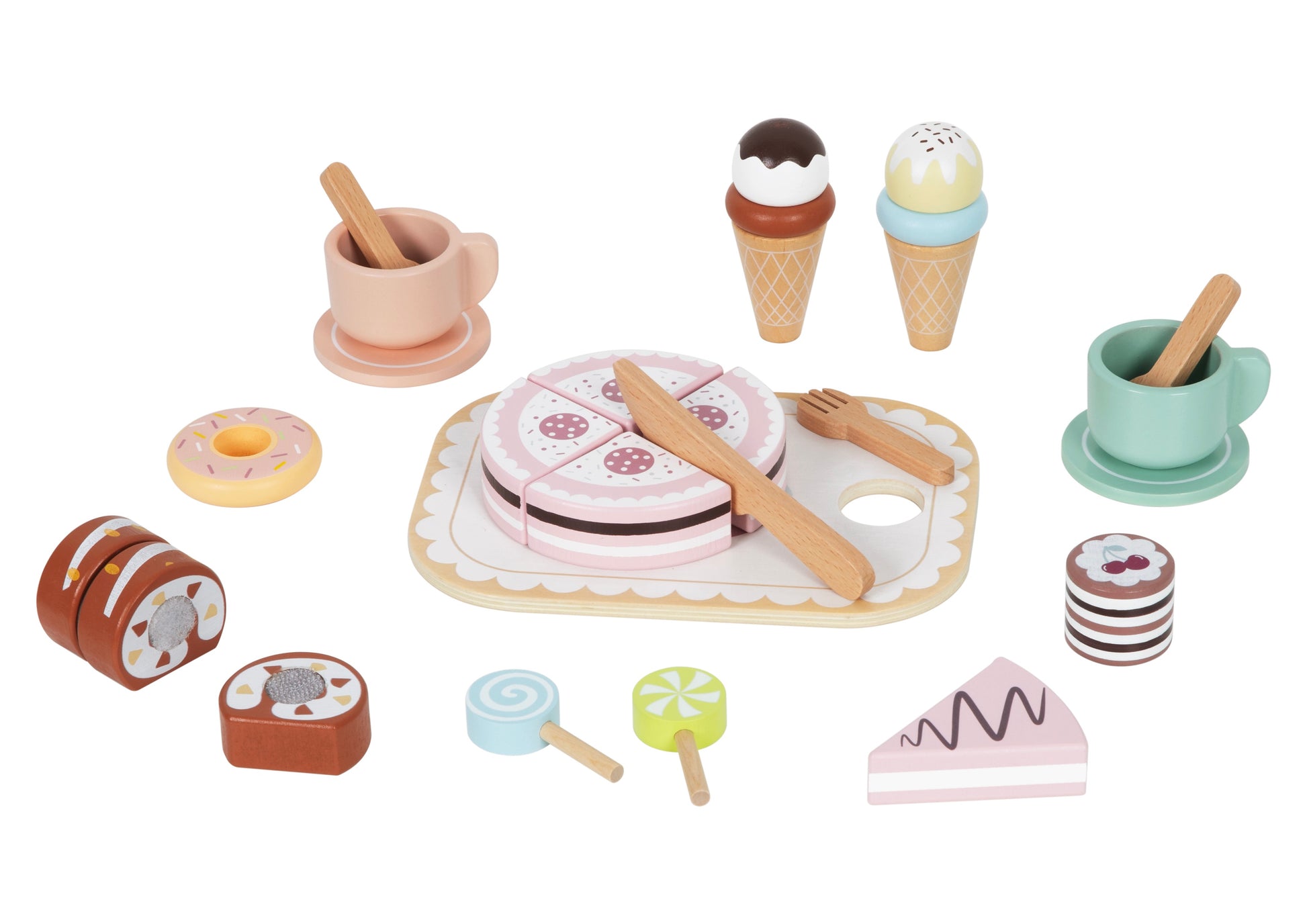 Set de té y merienda de madera para fomentar el juego simbólico y la imaginación.