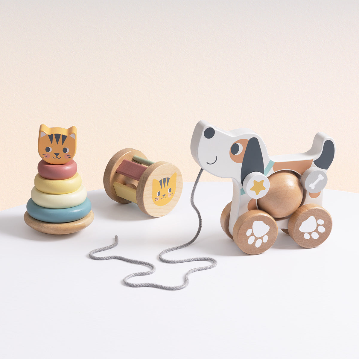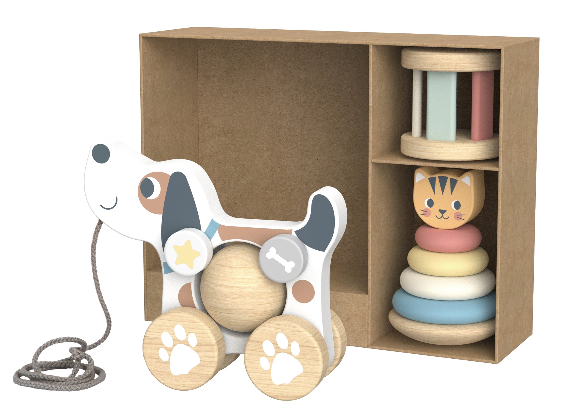 Un juguete de arrastre acompañado de piezas de encastre que estimulan tanto el movimiento como la coordinación. Ideal para acompañar los primeros pasos, fortaleciendo el equilibrio y la motricidad gruesa.